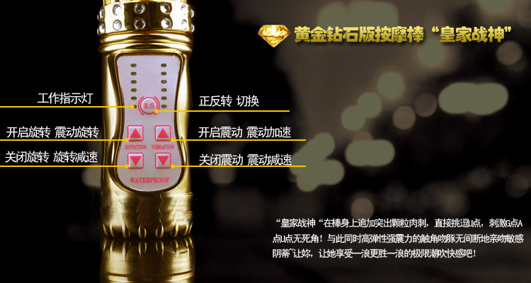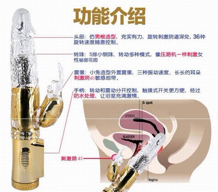 猛龙过江充电式转珠棒,直径3.5厘米,使用长度15公分,精致棒身手工镶嵌了20颗水钻,专为女性自慰而设计,高转速仿真阴茎,36段变频8段变速正反转控制共120种变化,震动兔子跳蛋可以刺激阴蒂,双重开关控制多种变化模式,锂电池充电,100%全是防水,同类产品设计理念达到最顶峰技术手法!本品根据日本性学会武藤兰性学博士根据女性阴道结构提出的G点C点爽刺激理论,在保留了棒身转珠和原有的头部摇摆G点按摩刺激的基础上,特别增加了颗粒状C点凸起部位,G点C点的同时刺激使女人更容易达到高潮。