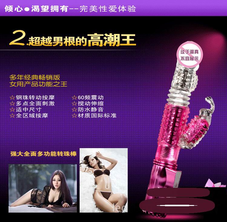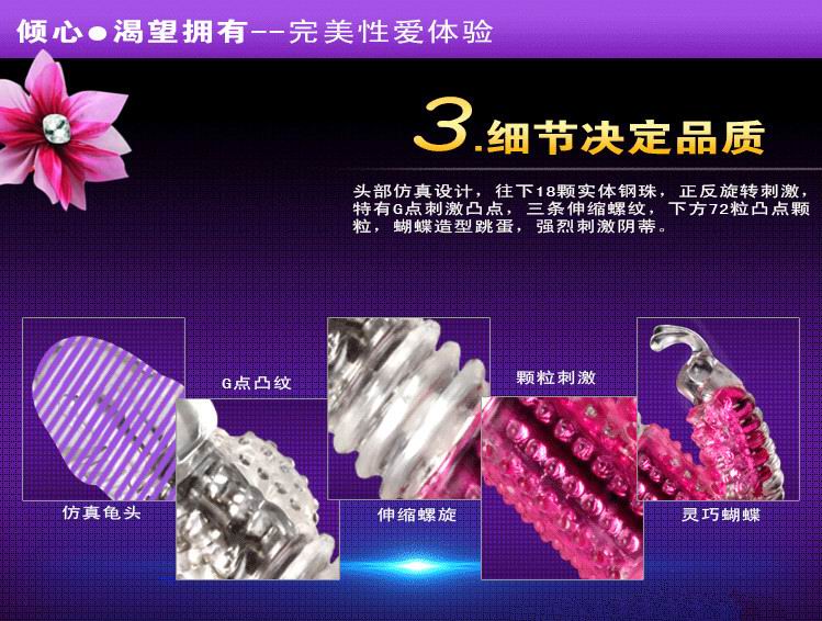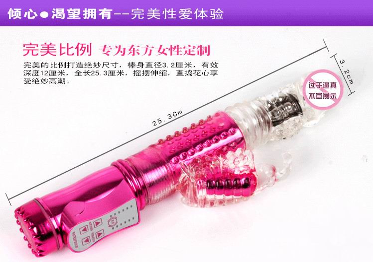 招蜂引蝶伸缩转珠棒掀起女用自慰器具新革命,变频振动刺激和强力伸缩转动(4节7号电池)代替了传统女用器具的单频振动转动,本品采用超软无毒无味果冻胶,一点味也没有的,不象大部分的女用器具多少都有点味!纯钢锻造的精钢齿轮,坚固耐用动力强劲!(绝对不是市面上的劣等货——塑料齿轮,价格低廉,用几次就坏,动力很差,稍有阻力就不能动了)。造型华丽高贵。龟头圆润,仿真的包皮设计,让浑厚的男性风采中略带着些微张狂,更具诱惑力,完全为亚洲女性设计,直径只有3.3厘米,,告别欧美版的粗大不适应。私密蝴蝶尽情拍打阴蒂更容易达到高潮,高潮升天率300%,伸缩速度每分钟80次! 想不高潮真的很难呀!
