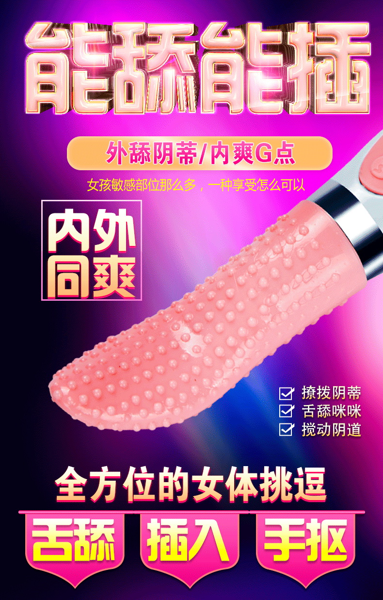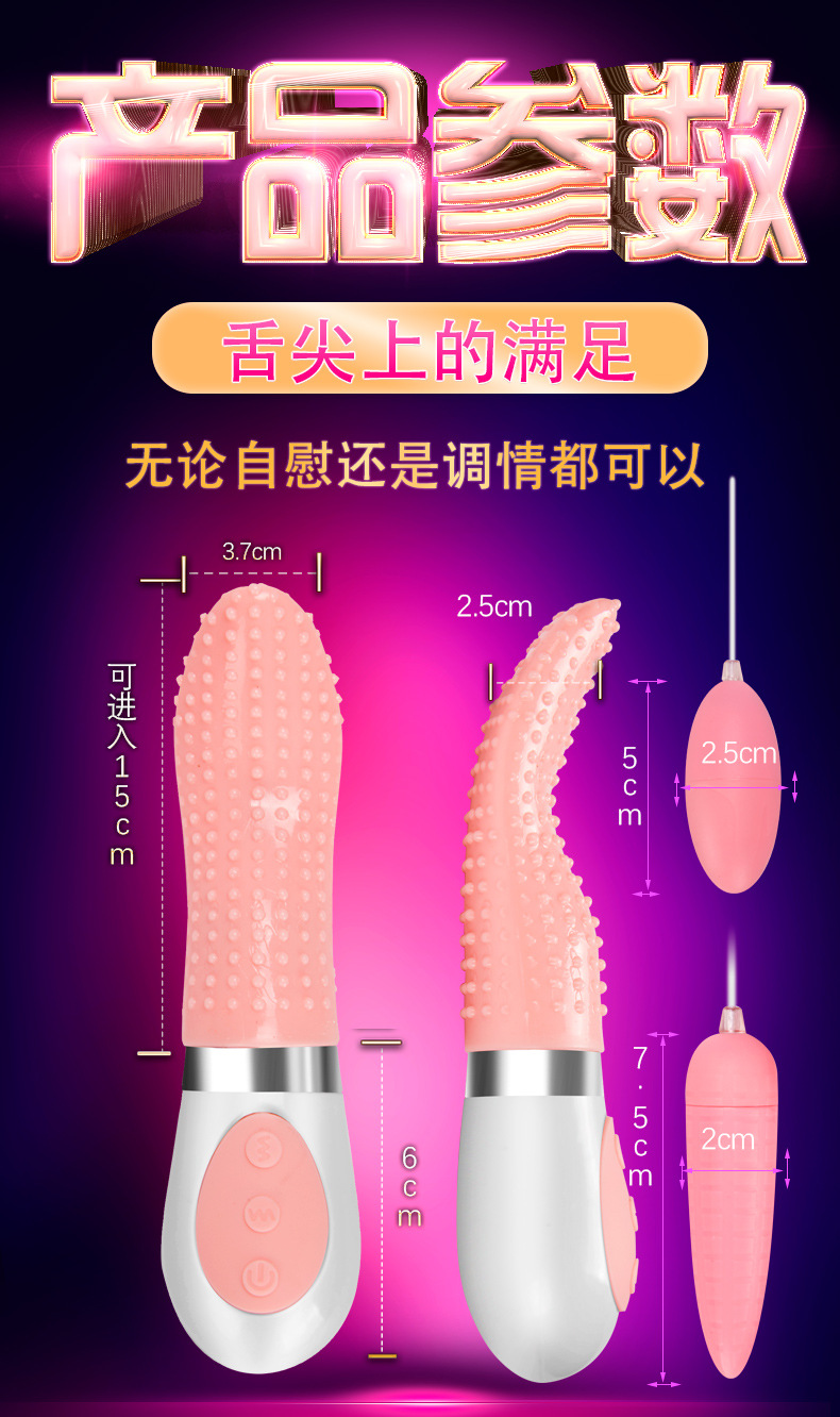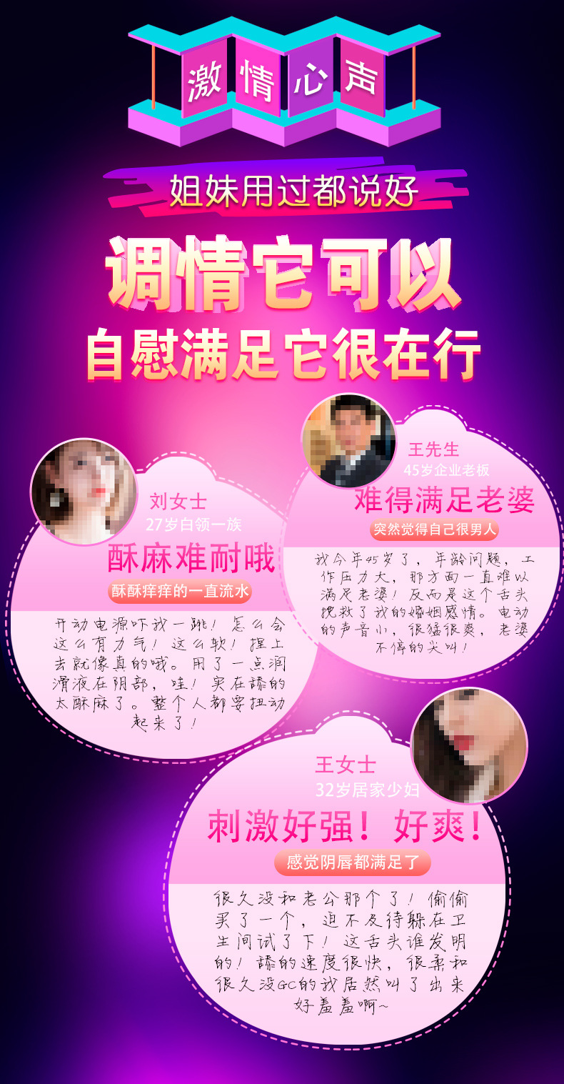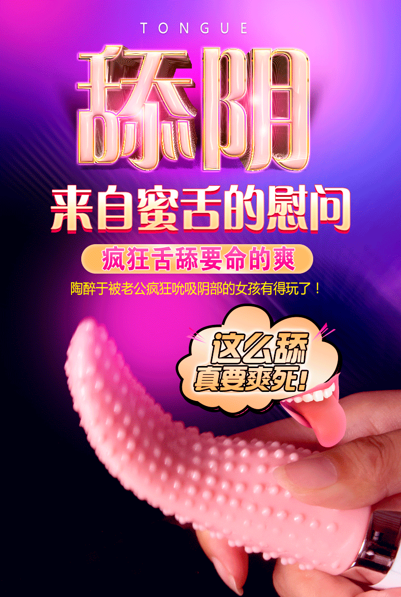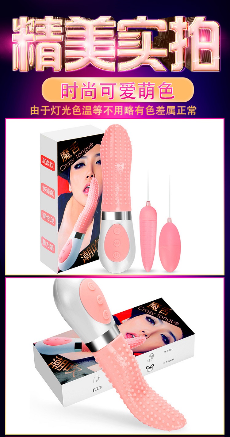 电动舌头女用口交器是非常刺激的女性成人玩具,舌头采用真人一比一尺寸设计,形状和大小简直足以乱真,7种不同的震动频率,疯狂舌舔要命的爽,它带来的快感和高潮是人力所无法达到的!