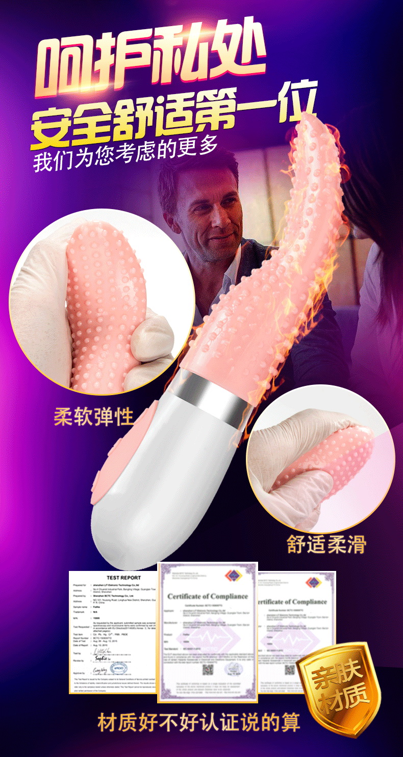 口交器使用有机硅树脂制成,电动舌头柔软到任意弯曲或拉伸均可恢复原样,超柔软舌体柔中带软、软中带韧,充分贴合传导,有如真人舌头口交般细腻触感,舌面上仿真设计了许多味蕾状突起,可提高使用时的摩擦快感,是夫妻调情和单身女士的最佳选择!
