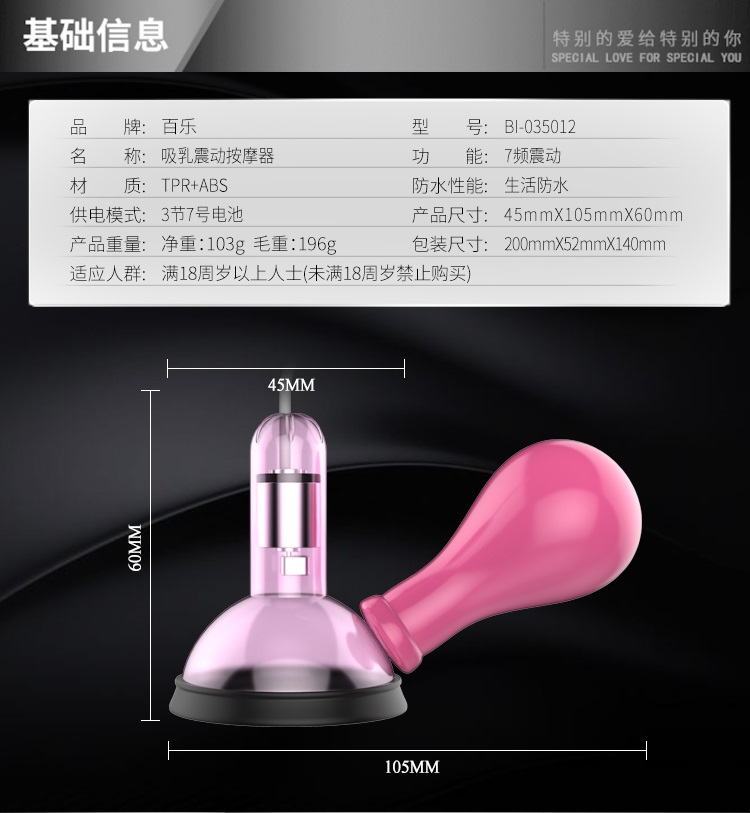 电动真空吸乳器是一款新颖的女用吸乳震动按摩器,乳头是乳房的中心,也是整个乳房的血液循环调节中心,同时是整个乳房的末梢神经中心,电动吸乳器有七种不同脉冲震动,七段变频震动带来七种不同的震动效果,各种不同的刺激对乳头会产生不同的应激反应,刺激你多重递进的欲求,无论是上面那高耸弹性的双峰,还是万般柔情的私处,都能带来非凡的冲击!