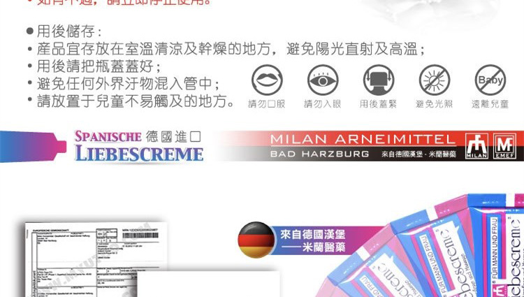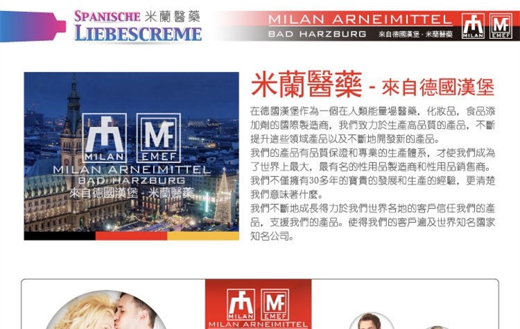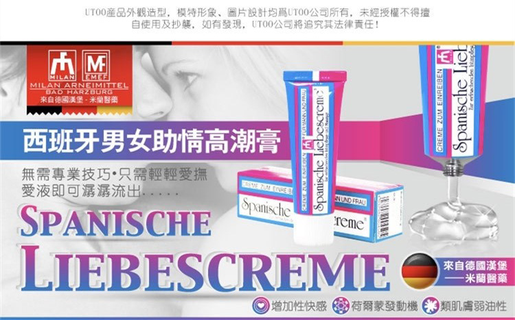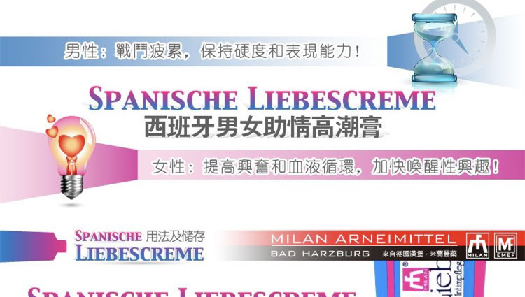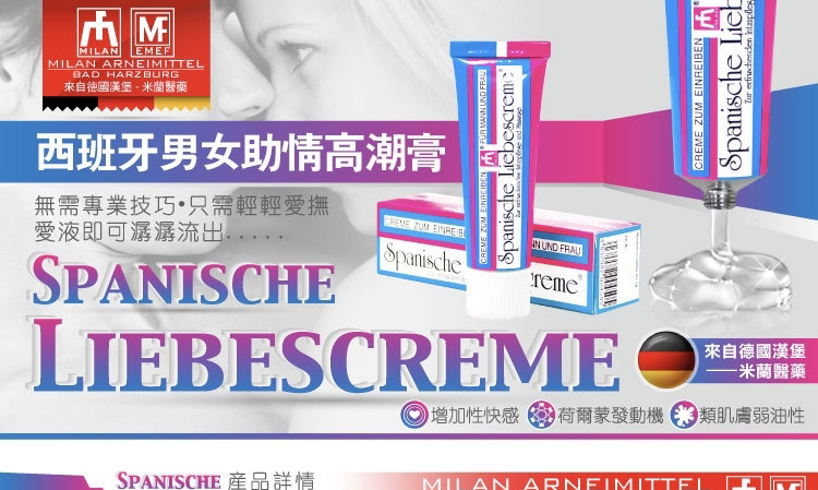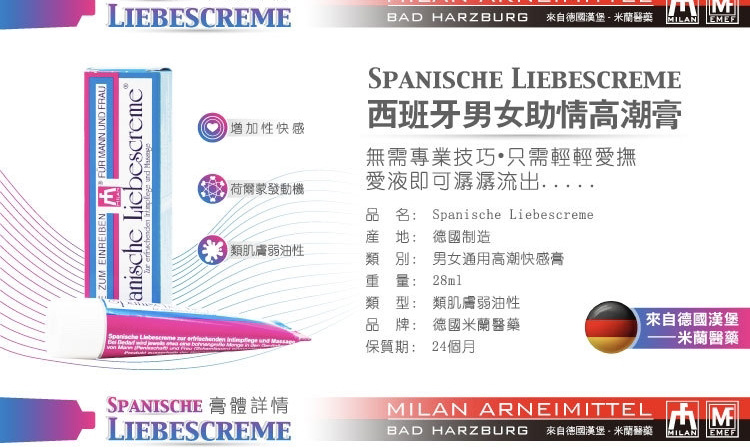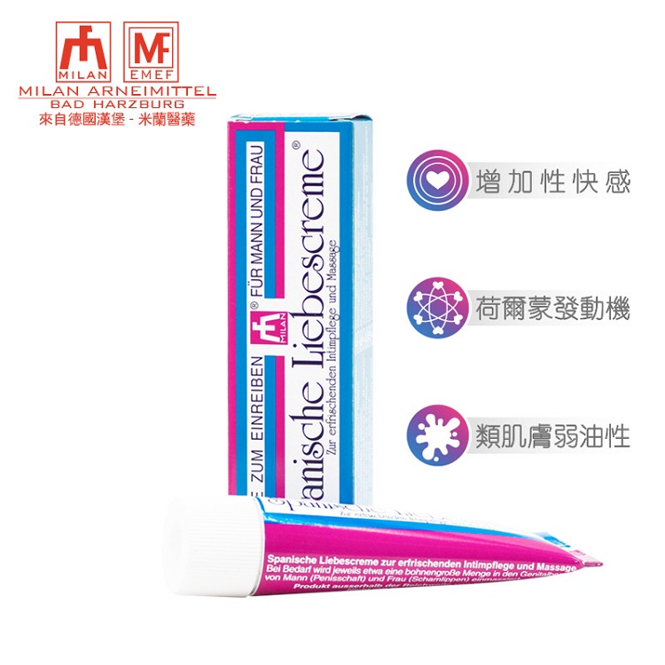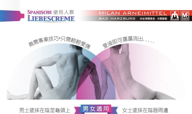 德国进口男女助情高潮膏是使人煽情的催情膏,由德国米兰汉堡人类能量医药研发,米兰致力于生产高质量,无副作用的产品,作为一个在性用品医药领域有着30年丰富经验的国际制选商,产品热销欧美亚100多个国家。