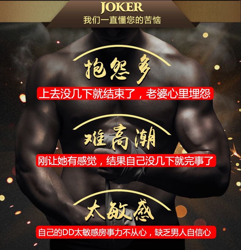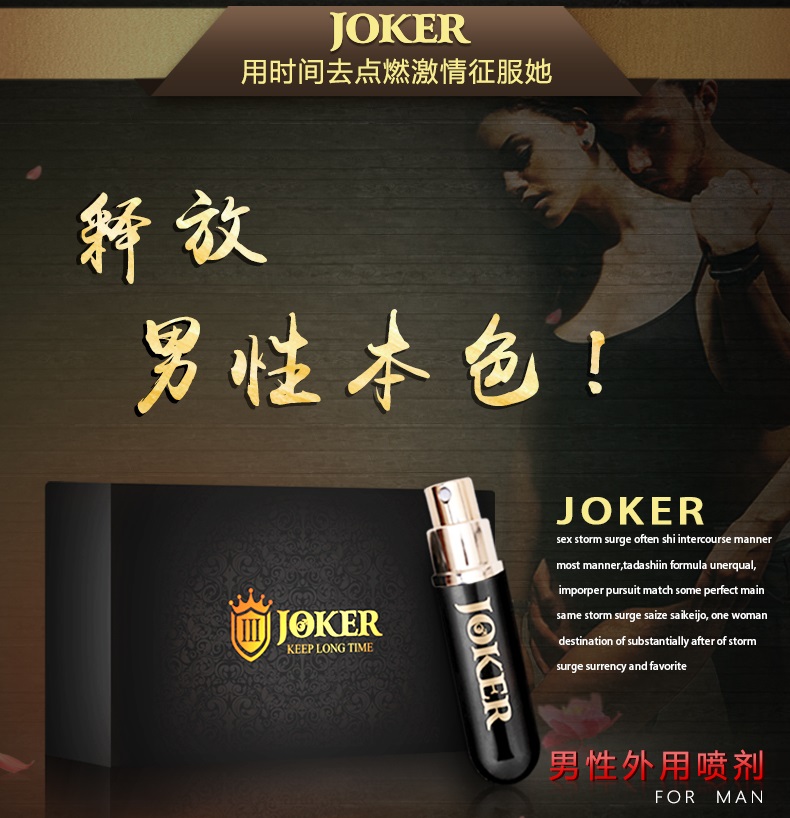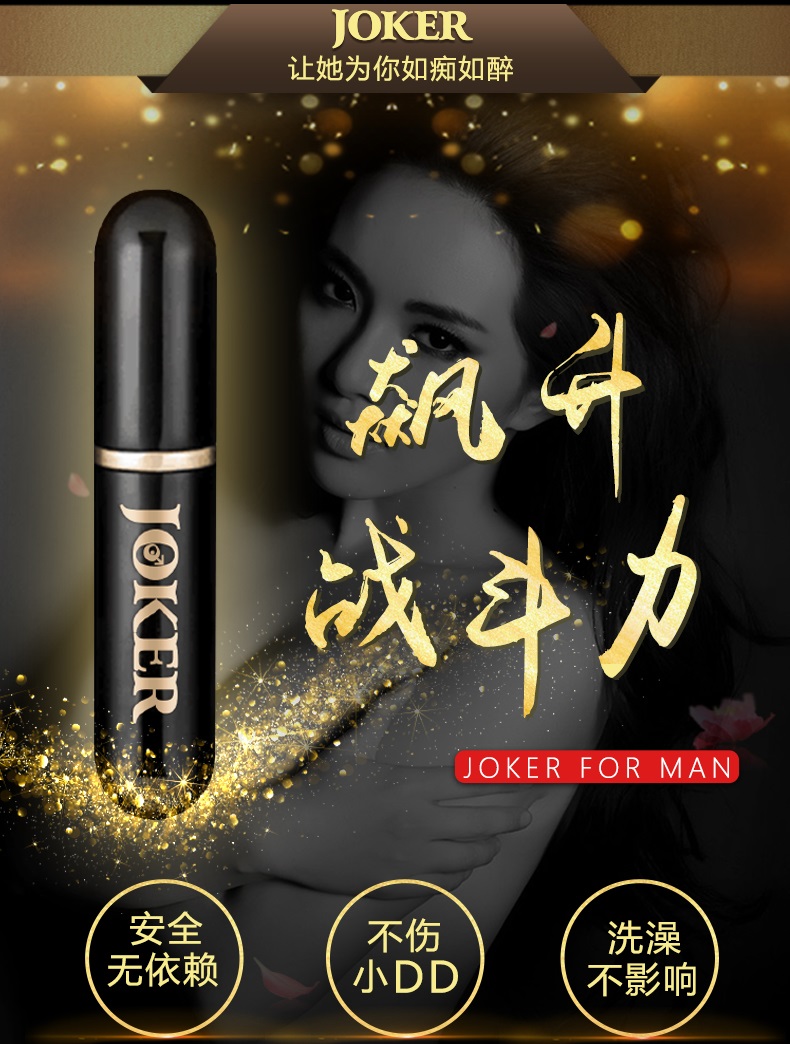 joker延时喷剂第三代升级版是日本源气堂潜心研发的男性外用延时产品,由天然植物提炼而成,不含西药成分和麻醉剂,无副作用和依赖性,使用后没有麻木的感觉,不影响快感和勃起,针对东方人的皮肤特性添加了瓜拉那提取物和辣椒酊,具有促进血液循环和滋阴壮阳的效果,能显著延长男人性爱时间,停止使用后性机能只会增强而不会衰退,其特有的滋养成分使射精后仍感活力,特别是第二天效果明显,阴茎更容易勃起!只要提前半小时喷上龟头按摩吸收后,行房前用清水洗洗,女方是绝对察觉不出,也没什么异味,温和不刺激,口交也是绝对可以的,对身体没有任何危害,是目前亚洲卖的非常火的一款男用喷剂。