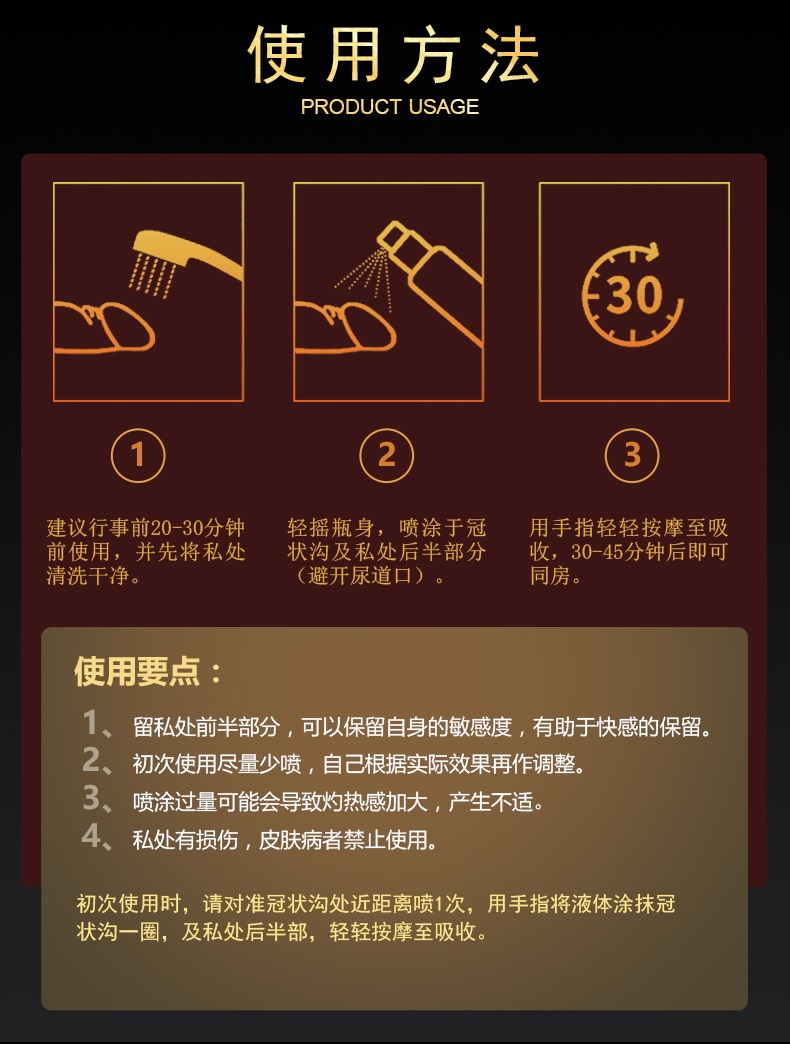 | 注意 | 需提前30分钟使用,勿喷尿道口 |