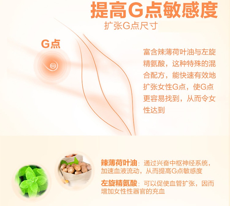 G点快感啫喱是用来帮助女性获得性高潮的理想产品,只需将其涂抹于阴道内G点附近并按摩三分钟,小蜜洞便会微微发热,阴蒂勃起外露、阴唇收缩紧绷、爱液分泌增加,让欲望之火在女性身体内剧烈燃烧,情不自禁的渴望与男人交合,性交时高潮来得又快又长又强烈!