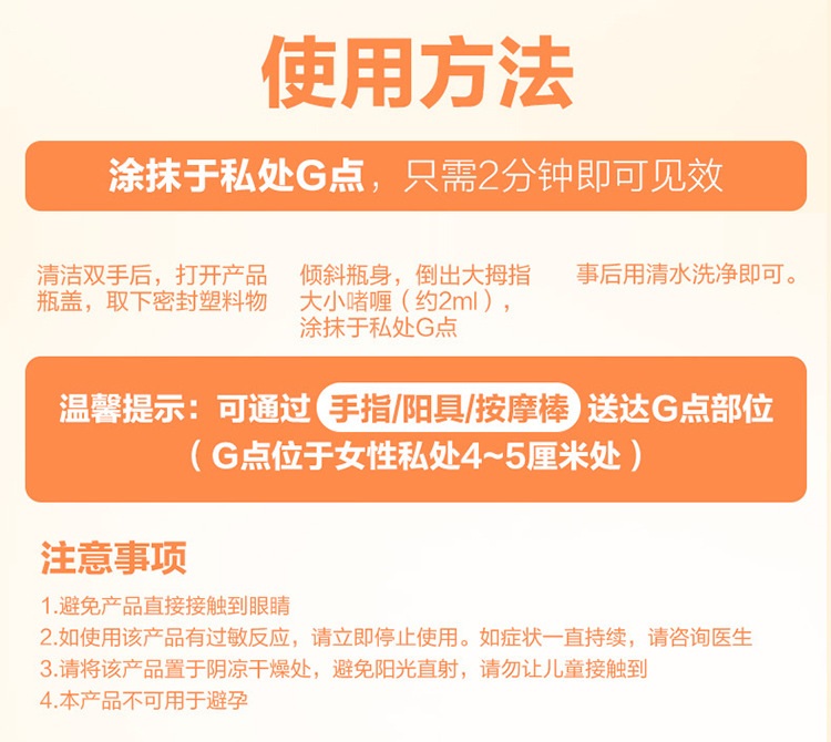 | 用法 | 外用,取少量涂抹于阴道内部G点 |