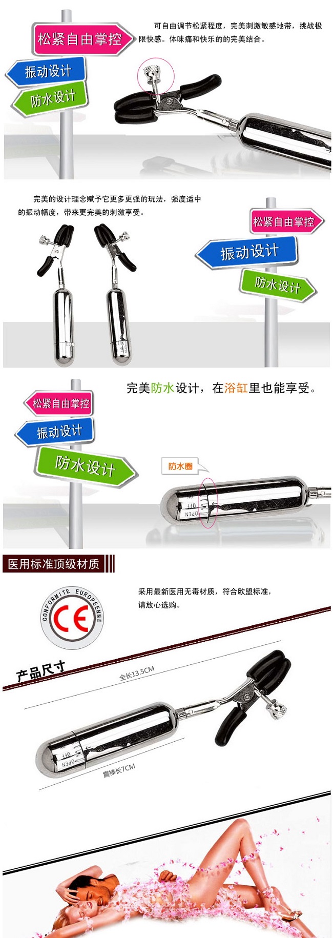 震动乳峰情趣乳房夹全长13厘米,震蛋长7厘米、直径1.6公分,是一款迷你振动乳夹,松紧有度,金属质感,控制器与器具一体,轻巧的身体,小巧可爱,方便携带,柔软的胶垫包裹着它的头部,随心所欲的振速调节,刺激你多重的完美感觉,振动你那多彩的情爱世界!