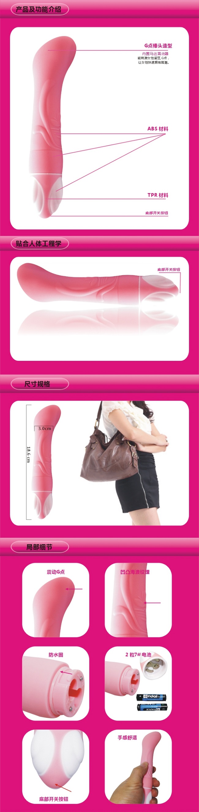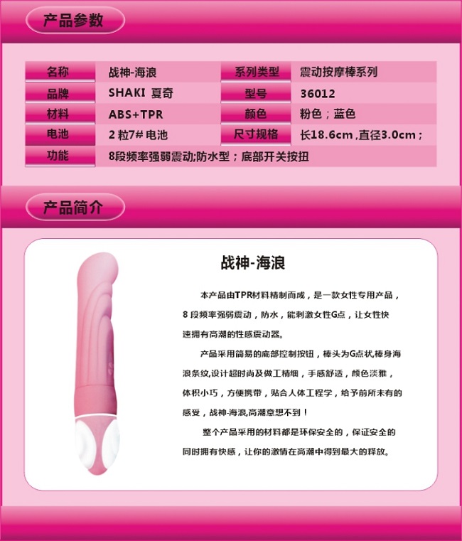 战神海浪挑逗震动棒是G点挑逗产品的最新力作,采用美国最新医用无毒虚拟肌肤材料,表面磨砂做工非常精美平滑之极,通过全球最严格的欧盟CE质量认证,绝对安全 !8段变频变化明显,有强有弱、有快有慢,刺激你敏感的G点!本产品更是一件美貌与品质具备的艺术品,超级静音、100%全防水设计,一切都是那么完美,就连店家刚拿到战神系列的时候都惊叹万分,绝对是上乘之作,绝对让你爱不释手!