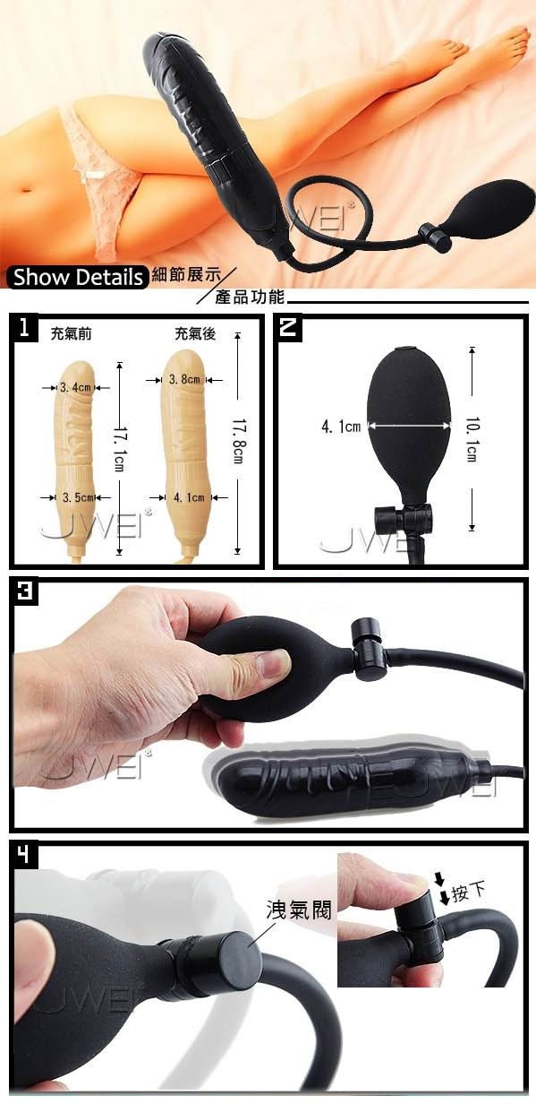 充气膨胀阴茎可以透过汽囊的作用,使后庭栓增粗,让你根据自己的喜好自由选择它的大小,到达高品味的渴望与需求,气囊的起伏让器具更粗壮,轻按气囊边的小汽阀,它立刻会恢復到原始的大小,让你自由变换大小,体验不同方位的性爱。