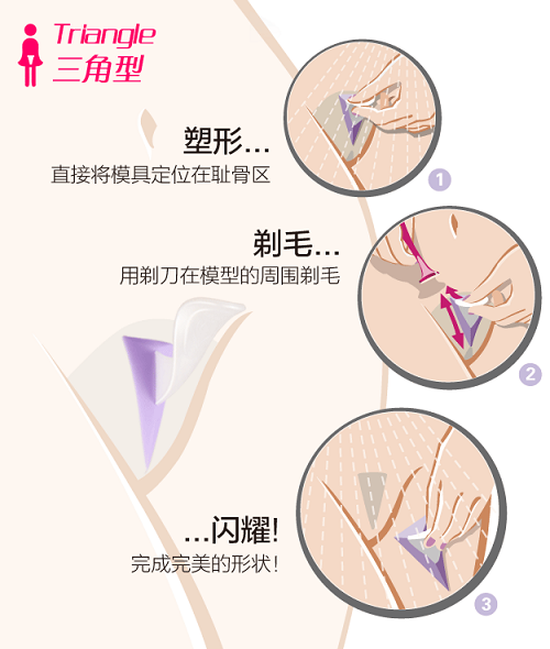 女士私处剃毛器,为你的阴毛玩出百变造型,美国花花公子杂志曾经做过调查,女士整齐的阴毛对男性的吸引力会增加200%,男的都是视觉动物,现在就让他看到最美丽的你,同样他会知道你这么做是为了他,你们的幸福指数会直线上升,剃毛器共有三款模板,分别能剔出心形,三角型和一线天,选购时请选择您要购买的模板类型哦!