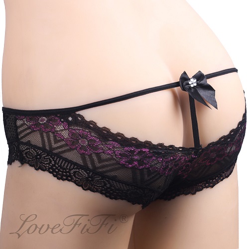 蕾丝露臀蝴蝶结内裤为紫色和黑色相间,黑色精致蕾丝镂空,露小屁屁更让人心动脸紅,搭配诱人带钻蝴蝶结,动人魅力完美呈現,前面采用棉的材质,穿起来十分的舒适,后面蕾丝镂空露PP的设计,又让性感升级,真是性感舒适两不误哦!爱美的MM们可以买回家当内裤穿的,时时刻刻的诱惑,你的他还能不掉入你爱的陷阱吗?