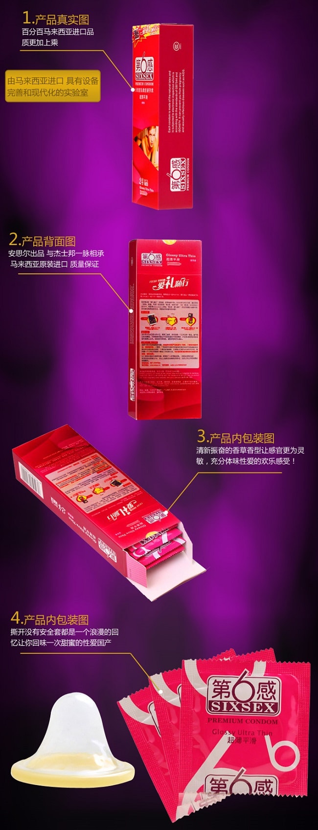 第六感超薄平滑避孕套,按女性生理特点分布,让您舒适自如,采用特殊工艺祛除讨厌的橡胶味,特有柠檬香,让你们在天然的清香中感悟一次爱的放送!撕开每一个安全套都是一个浪漫的回忆,让你们回味每一次甜蜜的性爱过程!第六感系列安全套均由进口优质天然乳胶制成,所有产品均达到GB7544-1999和ISO4074国际标准,可有效避孕、预防艾滋病等性传染疾病。第六感系列安全套因其可靠的质量和在保障生殖健康方面的有效作用,成为中国性学会唯一的安全套推荐产品。下单时记得写上喜欢哪种系列哦!