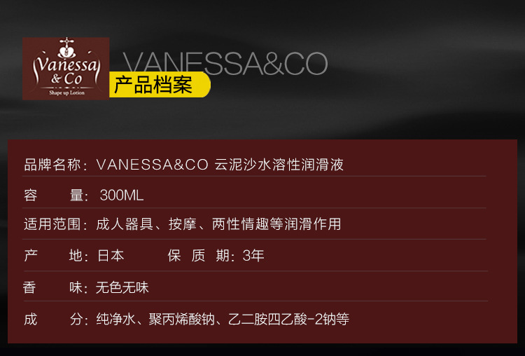 日本vanessa是非常牛逼的水溶性润滑液,按摩油?调情蜜汁?肛交?润滑剂?自慰润滑液?交欢润滑?通通没问题!看到日本AV吗?女优身上涂得滑滑亮亮的就是它!可以全是按摩、口交、阴交、肛交、配合器具使用,水溶性无色无味,目前为止还没有一款润滑剂能达到这种价位这种效果!把瓶口向下的话可以清楚的看到润滑液没有流出来,是因为它是高粘度的,不过却很容易清洗干净,这就是高档水溶性润滑剂的绝妙之处!