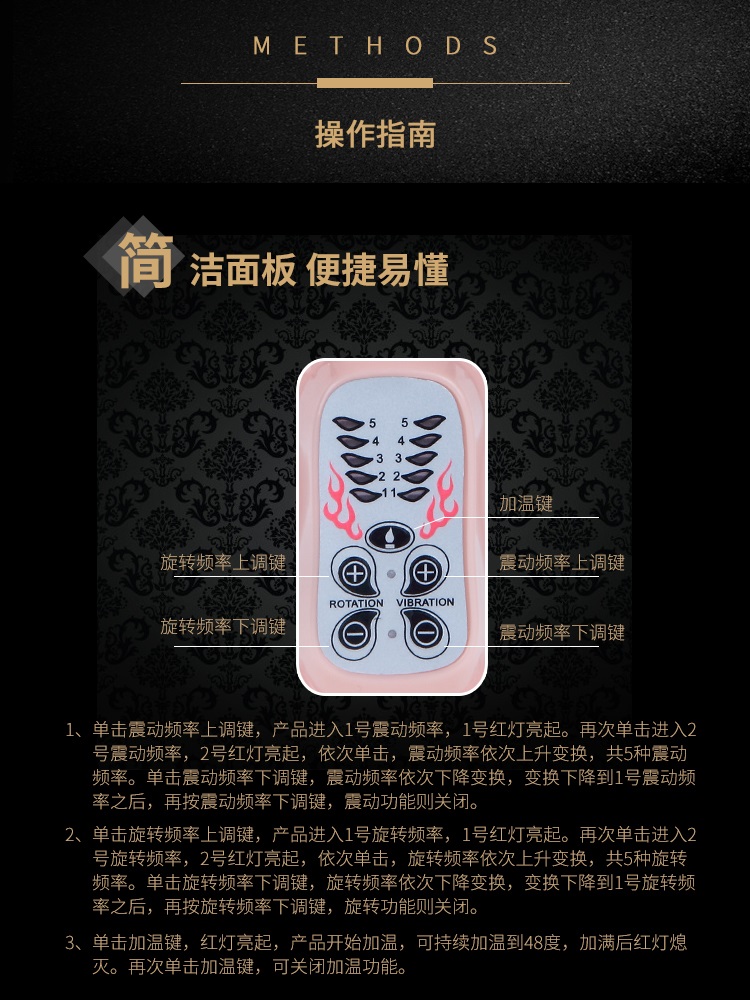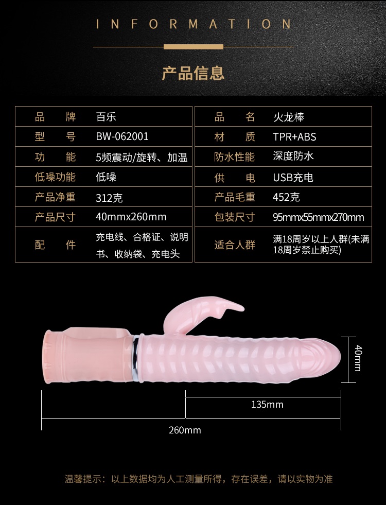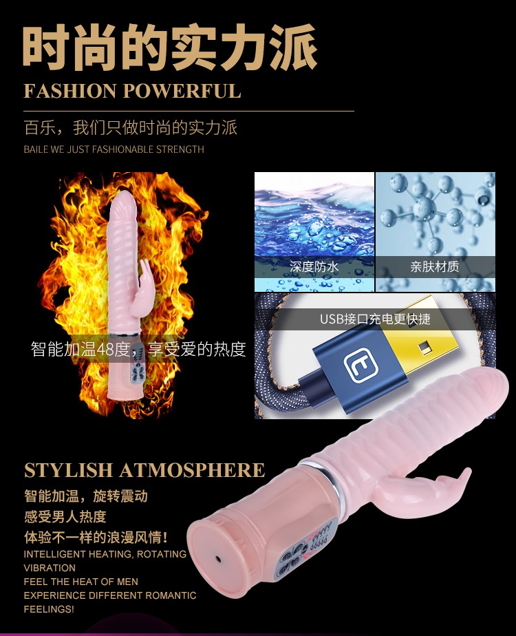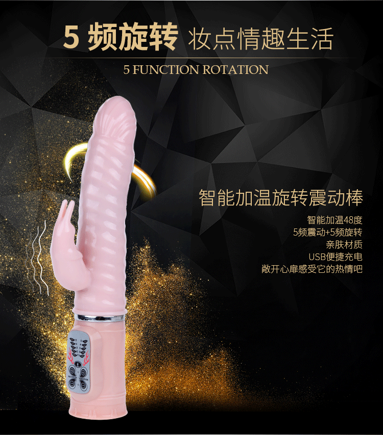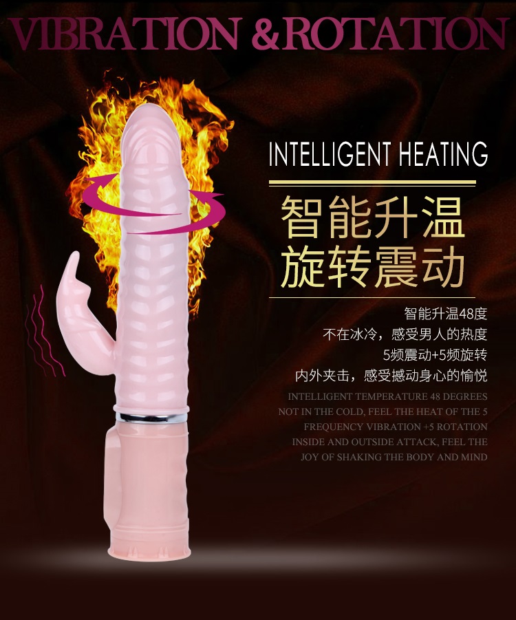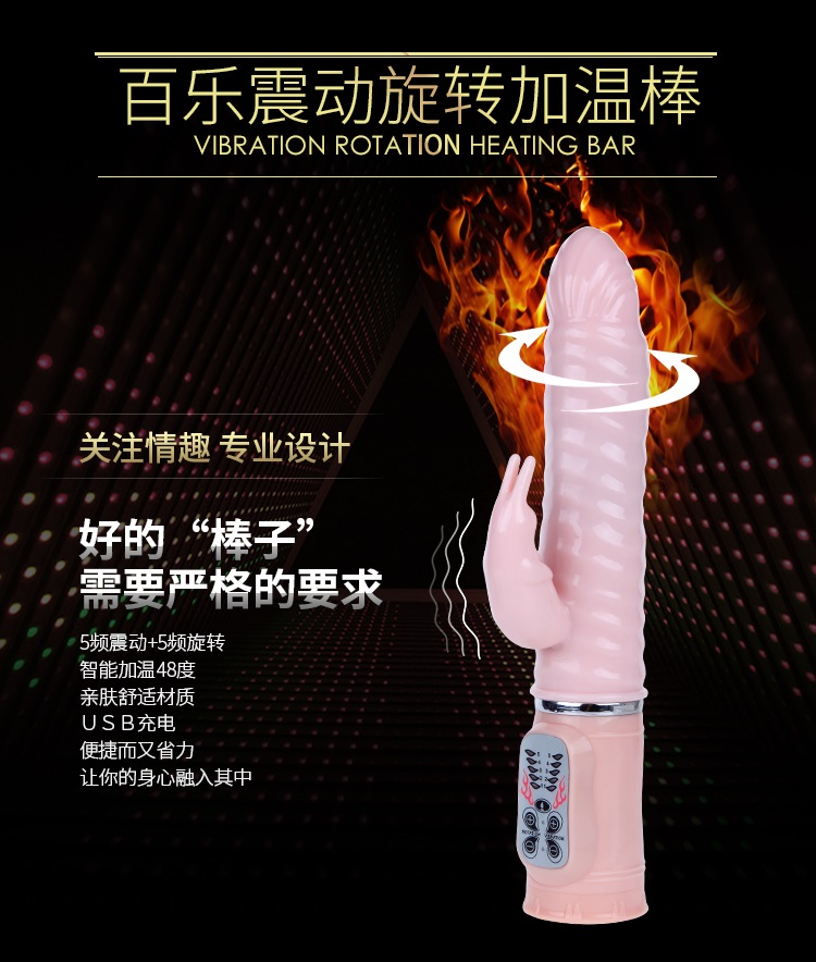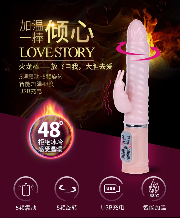 欲火赤兔充电加温火龙棒时尚设计的纹路弹性头,直接刺激女性G点,螺纹棒身紧密接触阴道侧壁,暖热与摩擦同时刺激阴道敏感神经,可左右摆动,五种旋转模式,大小可调,同时伴着舒适的颤抖,任借着自己粗长的身躯,直达G点,中部螺纹起伏的表面设计在运动中更能带给你波浪起伏般快感,分支部位有小巧可爱的振动兔子,5种模式的振动效果、时而快时而慢、时而点射时而连续扫射、不同频段刺激阴蒂,两片细长的耳朵能产生魔力般的振荡,不停地拍打你那神秘的私处,5分钟即可加热到48度体温,让你高潮时间更持久。