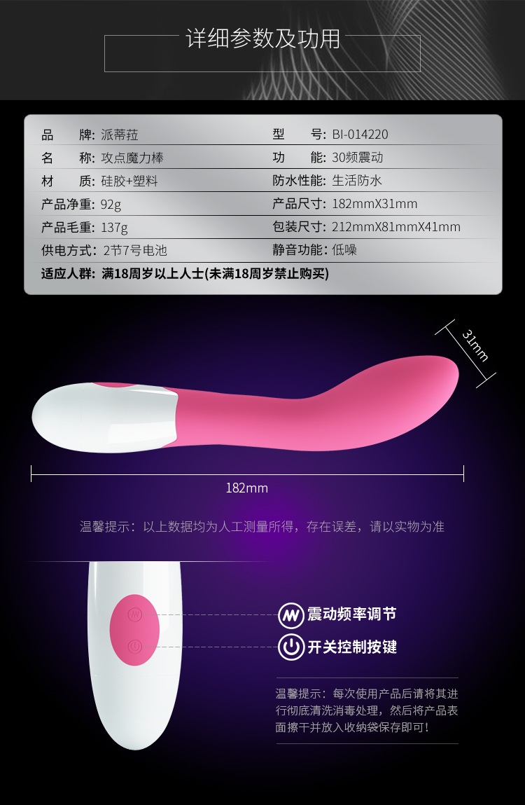 派蒂菈G点按摩震动棒符合人体工程学设计,长度18.2厘米,粗3.1厘米,更好的刺激到女性G点,让女性更容易达到高潮,多种震动模式和30种震动频率任你选择,带来欲仙欲死难以言喻的快感!强劲的动力配备超静音技术,令女人在享受梦幻的时刻不会受到外界丝毫影响!棒身使用高档硅胶材质,安全、舒适、卫生、耐用、防水,浴缸里也能使用,爱液再多都不怕。