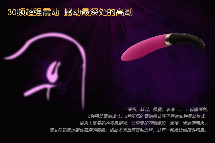 G点按摩棒香蕉型女用震动自慰器,采用高端医用无毒硅胶制成,触感与肌肤相近,非常柔软舒适,内置USB充电锂电池,30种不同频率震动模式,配上超强静音马达,既能用来刺激阴蒂又能深入刺激G点,滿足女性每一個私密性感帶的需求,开发女人的性爱潜能。