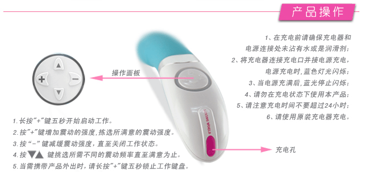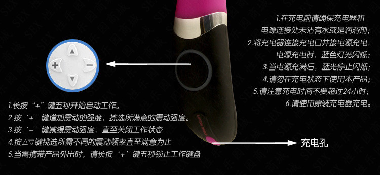 G点按摩棒使用方法:在关机状态下长按+键5秒钟可启动震动器,短按+键增强震动强度,短按-键降低震动强度,短按上下键可调节震度频率,共30种频率可供选择,在开机状态下长按+键5秒可关闭震动器电源并锁止工作键盘,使用后请用沐浴露或专用消毒剂清洗干净,保存在阴凉干燥处。