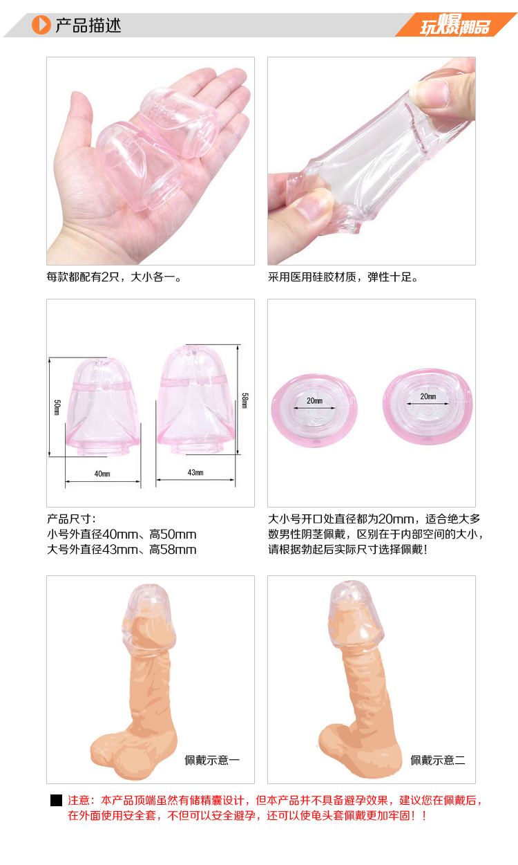 使用方法:把增大延时龟头套直接戴在龟头上使用,将开口卡在龟头后的冠状沟处即可,您如果担心会掉入女性体内,可在外面再戴上避孕套一同使用,用完之后按住避孕套将其取出。