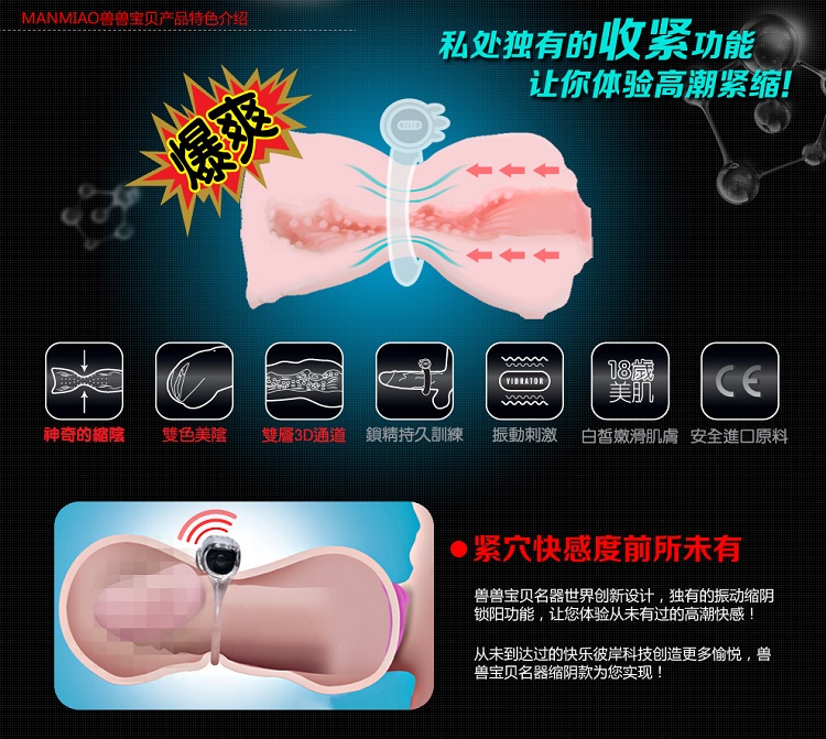 兽兽宝贝女阴倒模还是世界上首款有高潮的仿真名器,全球首创缩阴功能,戴有电动缩阴环的兽兽宝贝,鲜嫩的女阴宛如16岁少女般紧致,快感如同女性高潮时阴道收缩,收缩的阴道像处女般紧实,让你体验女性高潮带给你的快感与刺激,同时也可套在阴茎根部起到锁精延时的作用,并同步有震动刺激,体验从未有过的快感巅峰。