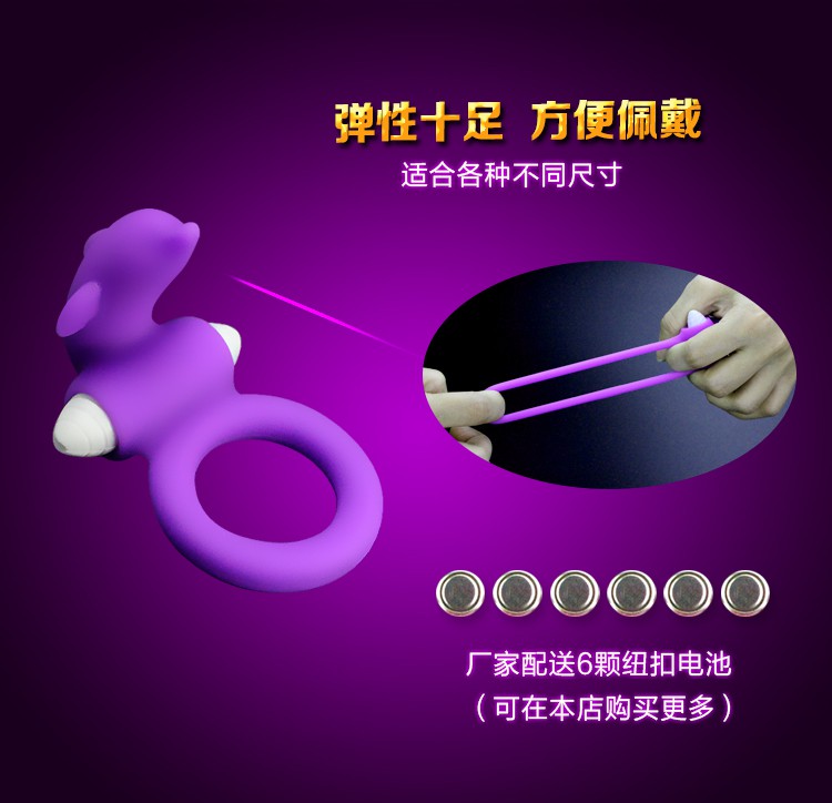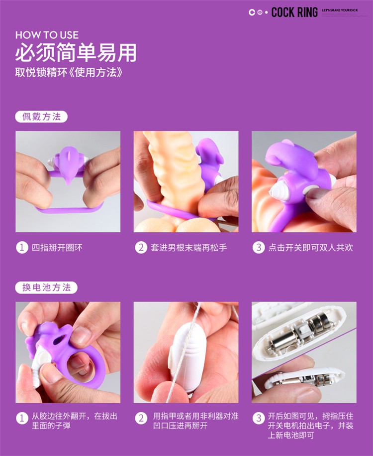 使用方法:直接把锁精延时震动环戴在阴茎上,然后慢慢移动到阴茎根部位置,最后启动震动器即可,本产品可重复多次使用,使用后请把震动器从男用情趣套环上拆卸下来,用沐浴露清洗干净,以待下次使用。
