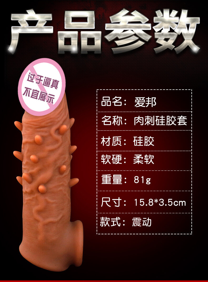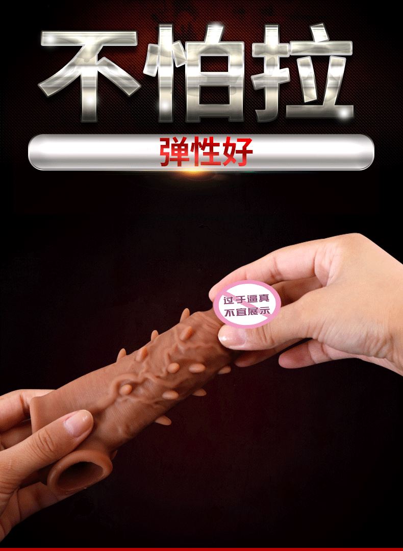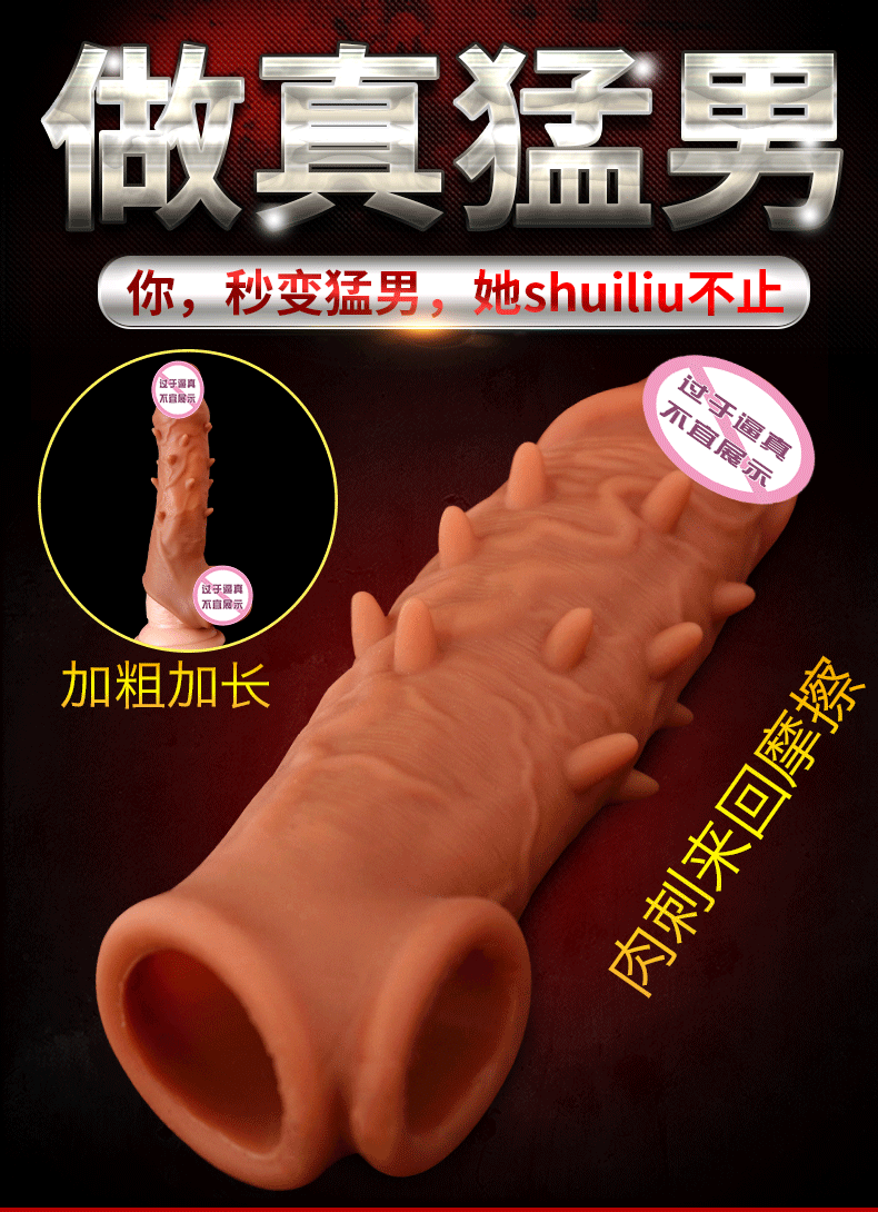 加长加粗锁精延时硅胶肉刺套是一款高档仿真狼牙套,疯狂的狼牙肉刺来回摩擦能够全方位刺激女性敏感部位,让女人获得更多的性快感,夜夜高潮就是这么容易!男士带上后能立马让自己阴茎加长4厘米、加粗1.5厘米,变大变猛,够粗够长,做一个勇猛的男人就是这么简单!三重锁精让战斗力提升,阴茎的强度比未穿戴时硬,锁住睾丸防止睾丸上提,使阴茎更坚挺达到锁精效果,加厚的套壁有延时功效,能有效降低龟头敏感度,让你房事时间更持久,让女人给你唱征服,整体使用高品质液态硅胶制作,紧密贴合360度全方位包裹,锁紧根部不易脱落,高弹韧性不怕拉不怕塞不变形,当老公出差在外,女士也可以把狼牙肉刺套戴在黄瓜或萝卜上当仿真阳具使用哦~
