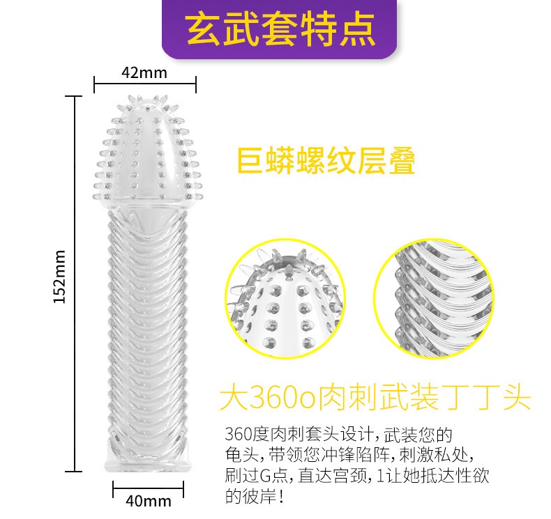 玄武狼牙水晶套,其身段和朱雀的区别是颗粒和环纹的区别,中段采用螺纹设计敏感度充分提高,喜欢爆破感的女性超级喜好,能迅速增强女性分泌爱液!体验不同快感。男优们再创玄武水晶套。
