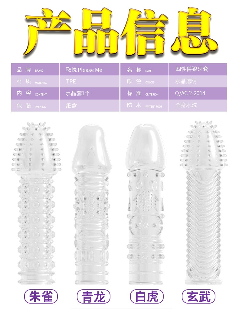 四性兽狼牙水晶套,一套共有4个,分别拥有不同的造型和功能,套于阴茎上使用,与安全套使用方法相同,不但有效延缓射精时间的功效,同时还起到加长增粗阴茎的作用,并且外部的狼牙还可以很好的刺激女性阴道内壁,使夫妻双方皆大欢喜!狼牙套通过特别的外型设计,肉刺+大颗粒+螺纹,每一种特点都起到了高效刺激女性阴道的作用,让女性高潮快速提升10倍,厚度的设计更是起到了五级延时的作用,在持久战与各种刺激的攻势下,让她颤抖连连,爱液喷发!