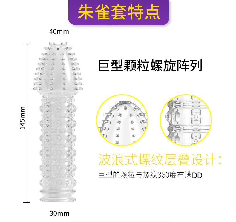 朱雀狼牙水晶套,是红色激情的象征,其身段是顶端加强刺激性爱套套,中段G大颗粒,这是女性长期得不到性高潮,为其设计经典的外形,师出同门,男优们为这类女性设计时重点强调顶段刺激,让女性的爱液分泌增加,同时获得高潮。男优提醒:容易获得高潮的女性使用本套套,容易抓伤男性皮肤,使用时要注意哦!