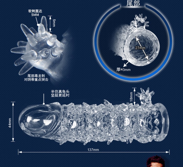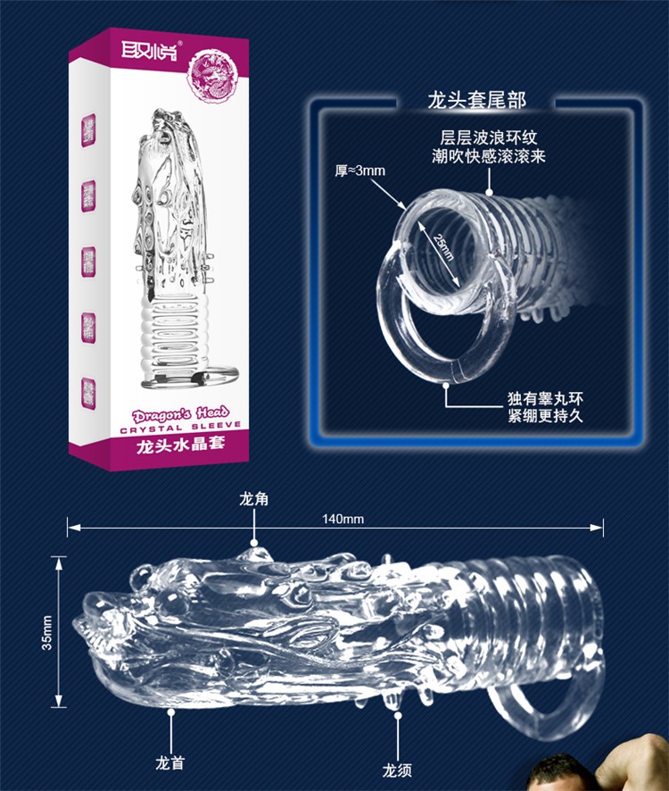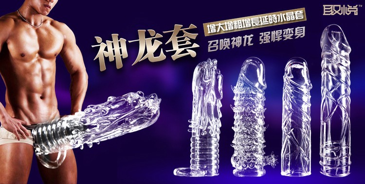 神龙套是使用医用透明软胶制成的水晶狼牙套,材质安全舒适柔软,无毒无害无异味,它的作用是增大男人阴茎和延迟射精时间,表面凸起的柔软狼牙还能强烈刺激女性的阴道内壁和G点,让女人高潮迭起,是房事必备佳品!