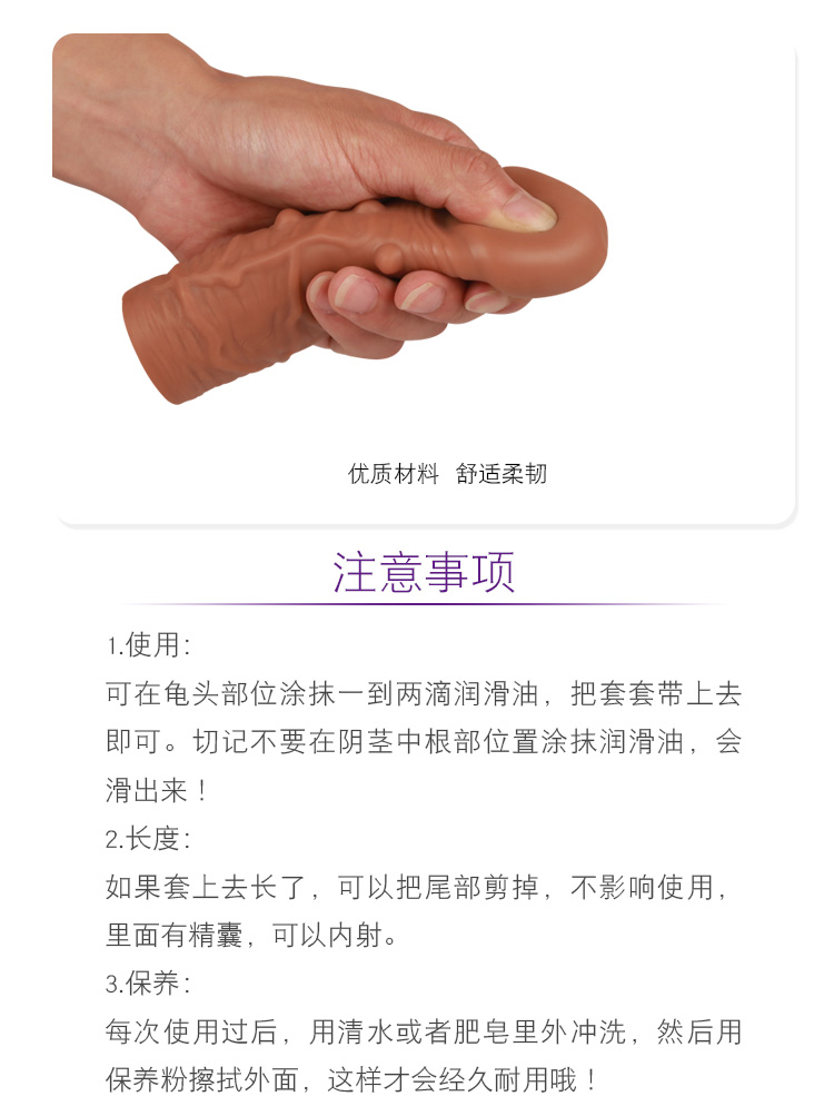 阴茎增大套全身防水设计抗菌不油腻,每次使用过后,用清水或者肥皂里外冲洗,然后用保养粉擦拭外面,这样才会经久耐用哦!如果套上去长了,可以把尾部剪掉,不影响使用,里面有储精囊,可以内射。
