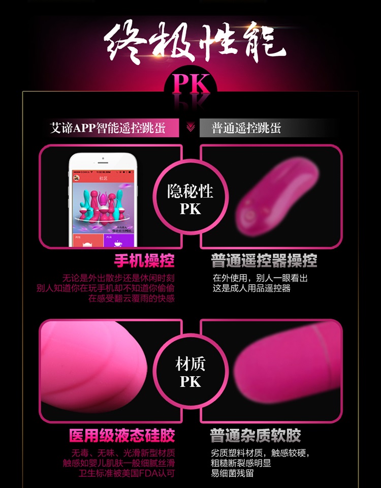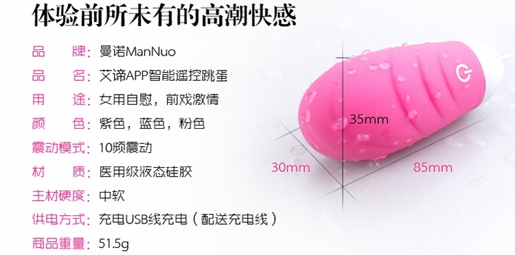 艾谛无线遥控跳蛋是可以用手机操控的智能情趣震蛋,女性自慰和男女调情的利器,具有无线遥控、10频震动、超级静音、全身防水、USB充电等多种实用功能,长度为8.5厘米,最大直径3厘米,使用顶级医用液态硅胶材料制造,无毒无害无异味,柔软舒适不伤身,是一款高端智能女用自慰器,能通过手机APP远程智能遥控,可随意切换经典的10种性爱节奏来体验各种高潮快感,还可根据音乐节奏自动调整震动频率,颠覆传统开创独特体验,专为感性女人而生,独有敲敲乐功能,可通过点击界面上的点震模式或者任意滑动曲线来变换震动力度,能通过智能手机进行超乎想象的远程互动,让爱不再有距离,超静音震动在大街上也可以随时享受,令女人的性高潮来得突如其然。