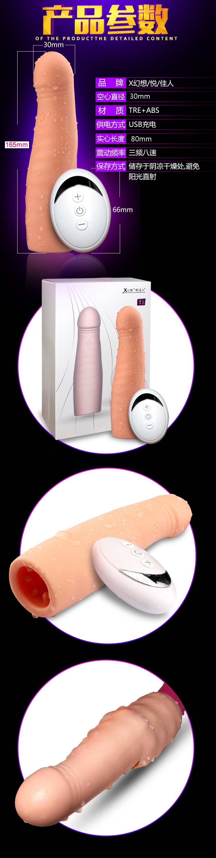 悦佳人USB充电无线遥控震动阳具套,史上第一款男女通用的震动阴茎套震撼上市,使用进口高档医用级柔软硅胶材质,无毒无异味,舒适逼真!USB充电口采用闭口设计,全身防水让您使用起来更放心,不再麻烦买电池!龟头内置的震动器有三种震动频率,八种震动速度,动力更强劲!50米超远无线遥控距离,使用更方便,可随时随地释放自我。