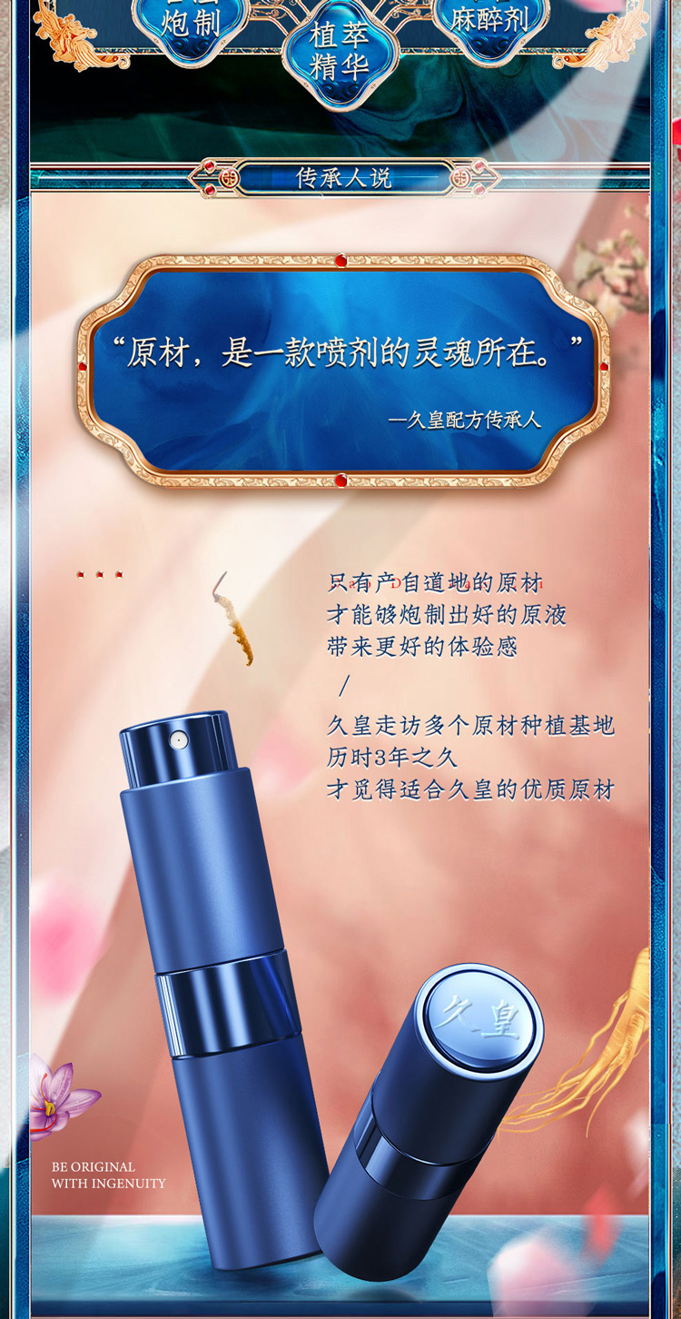 原材是一款喷剂的灵魂所在,只有产自道地的原材才能够炮制出好的原液并带来更好的体验感,久皇走访多个原材种植基地,历时3年之久才觅得适合的优质原材,不仅如此,久皇还遵循古训,发扬传统炮制工艺,通过不断优化和反复试验,终得这款风靡国内的延时臻品!
