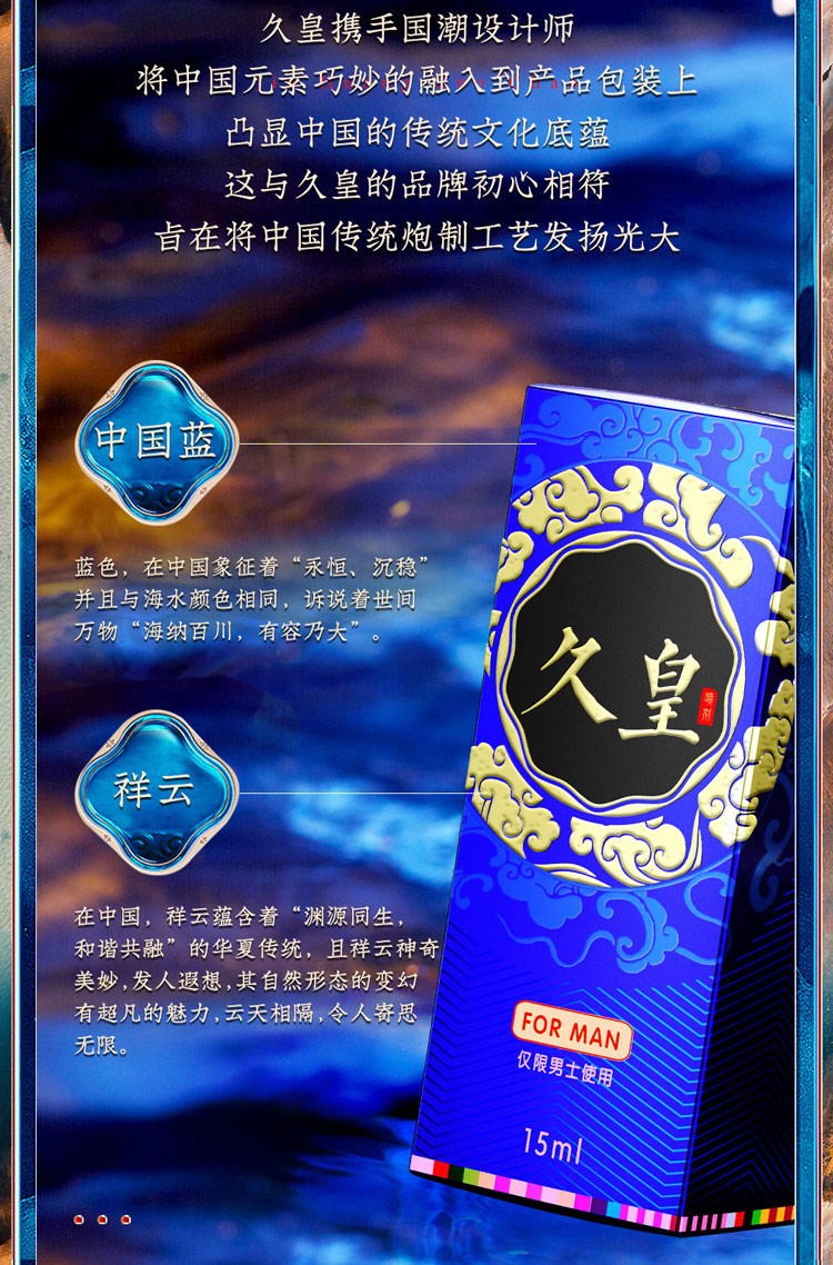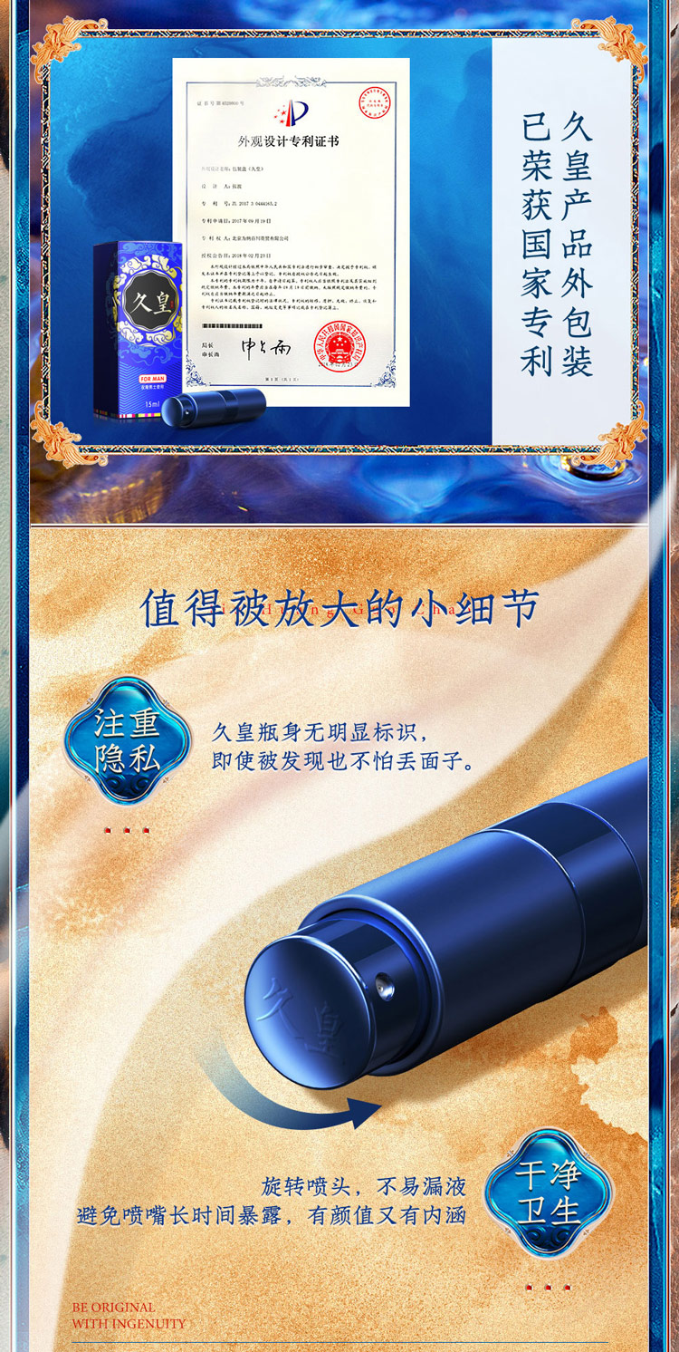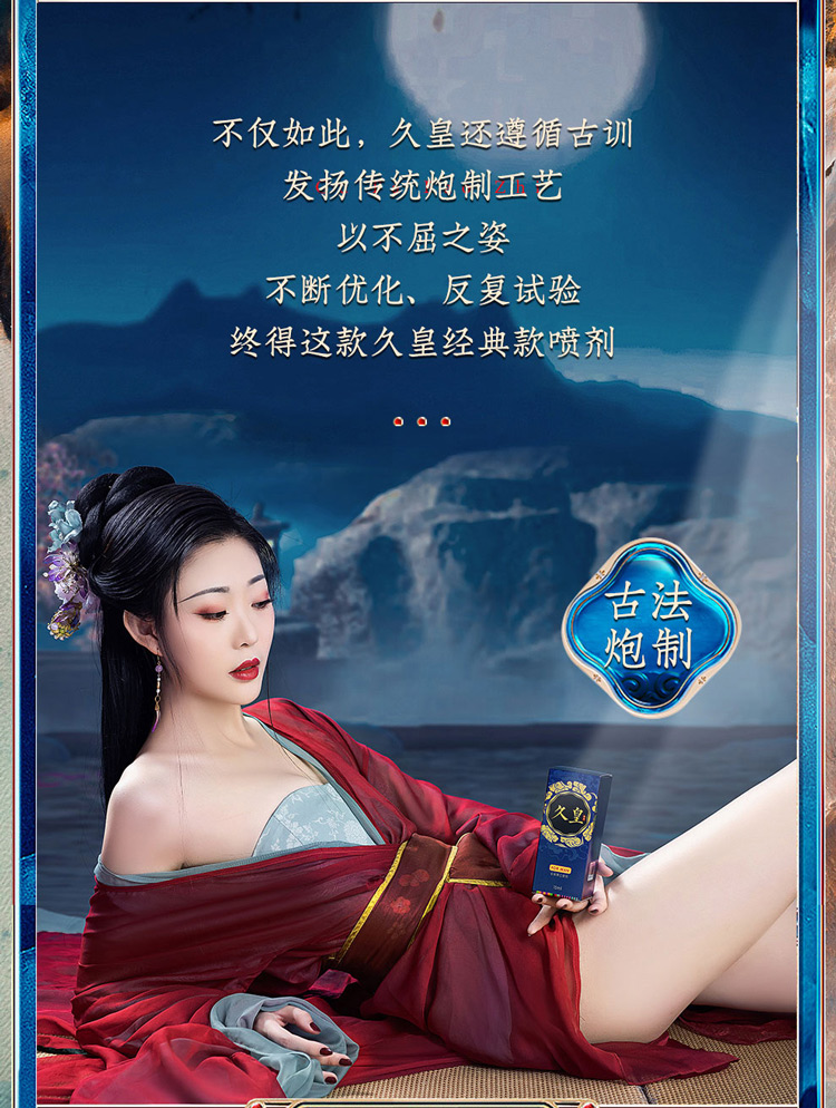 久皇男性延时喷剂采用古法炮制而成,百分百植物精华萃取,不含麻醉剂和酒精,道地原材赋予了它安全高效的延时能力,可增加男士性交时间半小时以上!