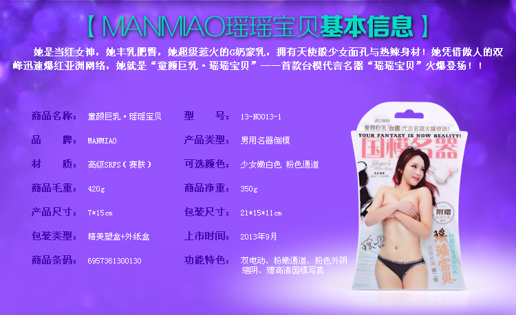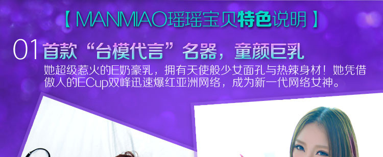 瑶瑶宝贝名器倒模百分百仿照瑶瑶的真实阴部倒模制作,是首款由台模代言的男用仿真自慰器,她是当红女神,她丰乳肥臀,她超级惹火的E奶豪乳,拥有天使般少女面孔与热辣身材,她凭借傲人的双峰迅速爆红亚洲网络,她就是童颜巨乳——瑶瑶宝贝!
