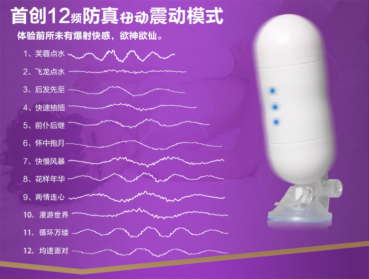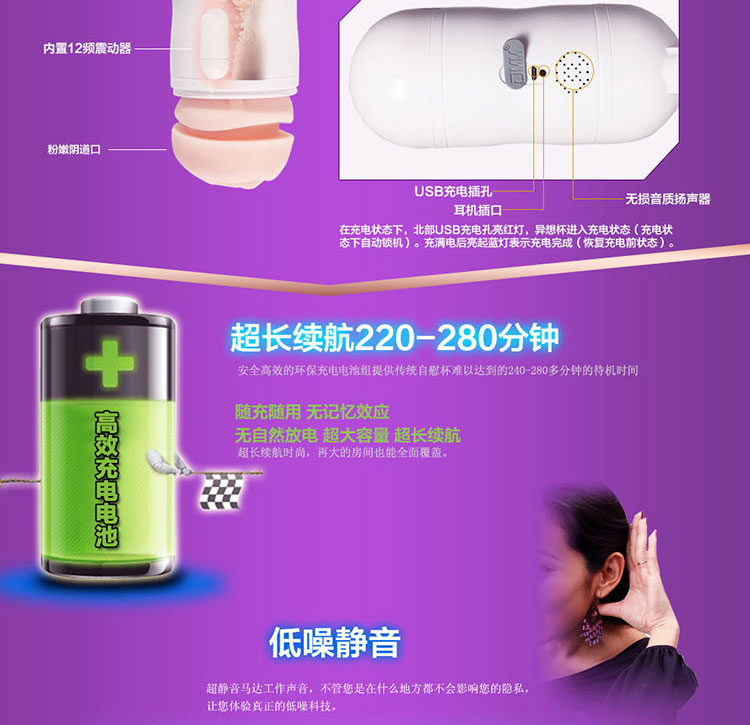 电动飞机杯外置喇叭和附送的高保真耳,可聆听嫩模销魂叫床声,提高听觉刺激,精神境界首先高潮!首创12频仿真扭动震动模式,低噪静音,非贯通型设计,插的越深,刺激越强,体验前所未有的爆射快感!