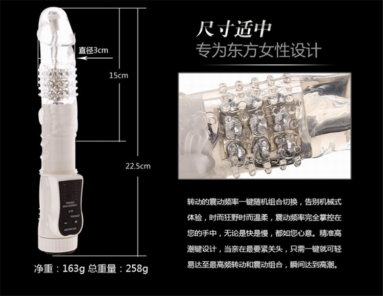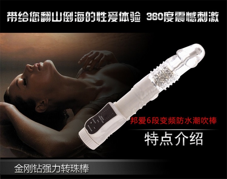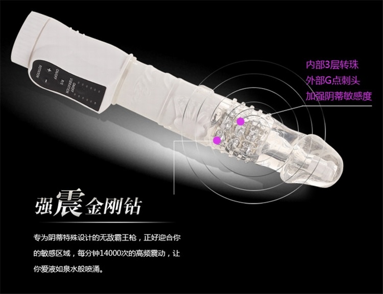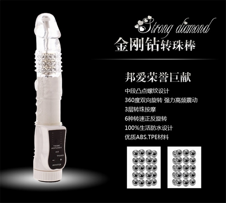 金刚钻转珠震动棒由香港邦爱公司生产,棒体具有旋转和震动等功能,六段变频震动模式,可独立旋转的顶端具备三种旋转速度,同时还具备正反转IC功能,头部为弹性仿真设计,透明胶体包裹五排金属转珠,智能旋转全方位刺激阴道内壁,使用突破性三层转珠按摩,比普通转珠棒增加一倍的刺激感受!