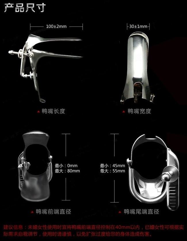 扩阴器必须在女性知情并同意的情况下使用,未婚女性使用时建议将窥阴器的鸭嘴直径控制在4厘米以内,已婚女性可根据实际需求进行自我调节,使用时请小心谨慎,以免过度扩张给身体造成伤害!